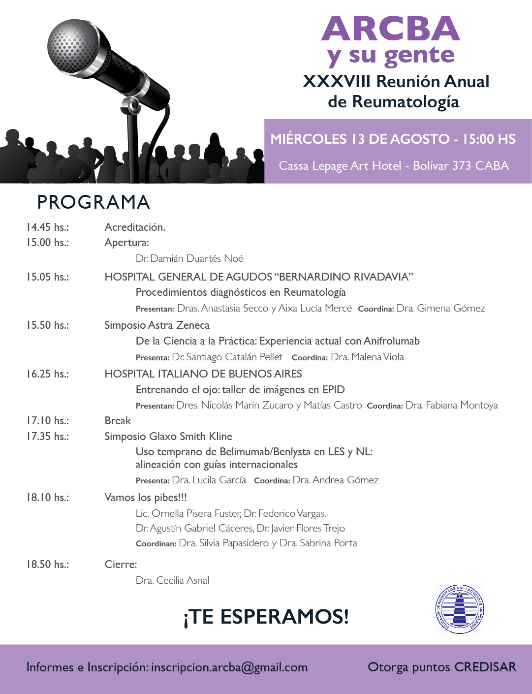 El miércoles 13 de agosto a las 15:00 hs, la Asociación de Reumatología de la Ciudad de Buenos Aires (ARCBA) realizará su XXXVIII Reunión Anual de Reumatología en el Cassa Lepage Art Hotel (Bolívar 373, CABA).